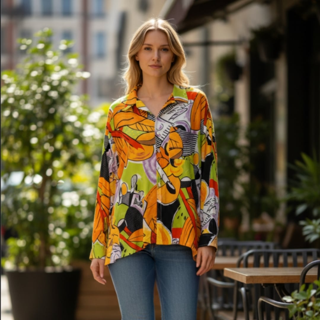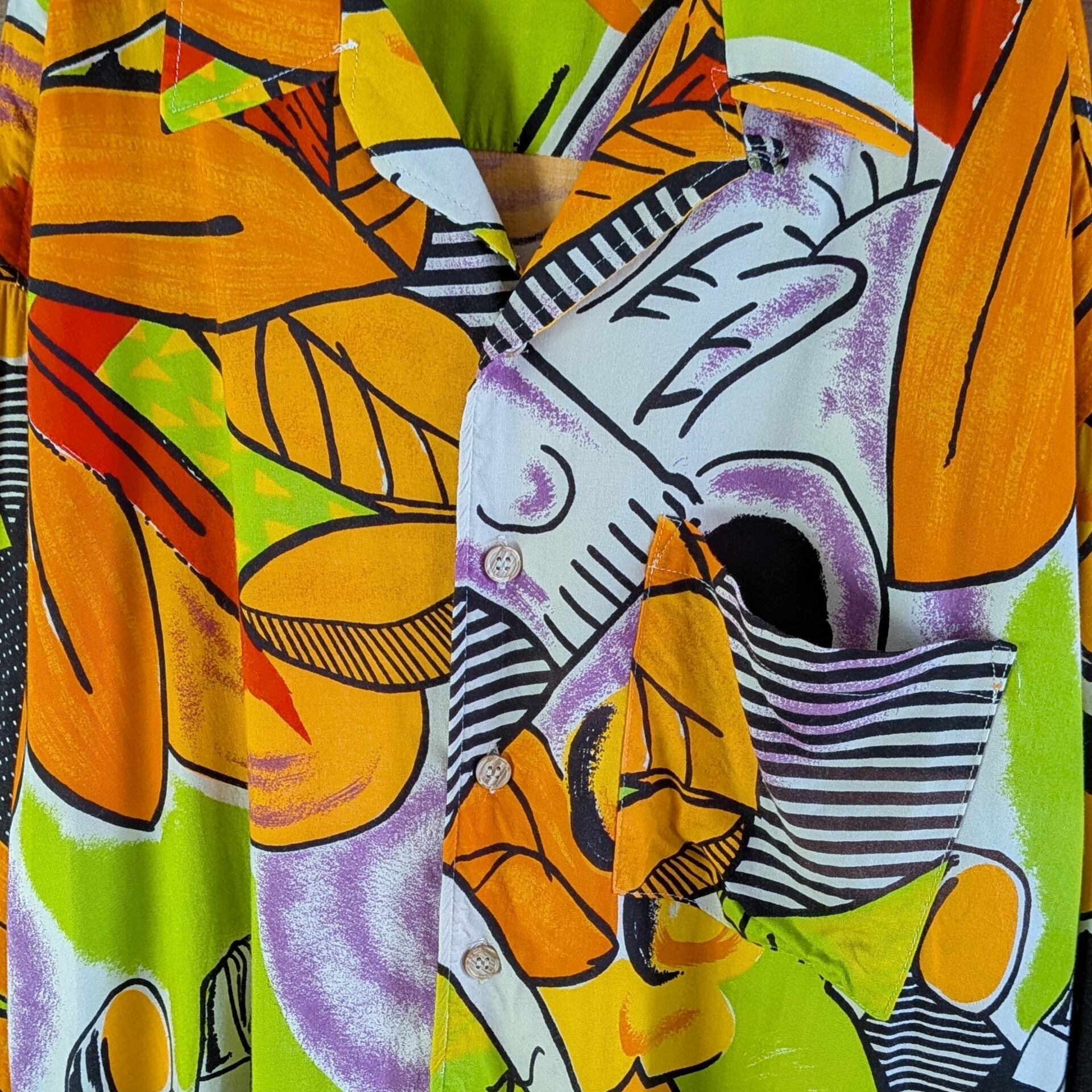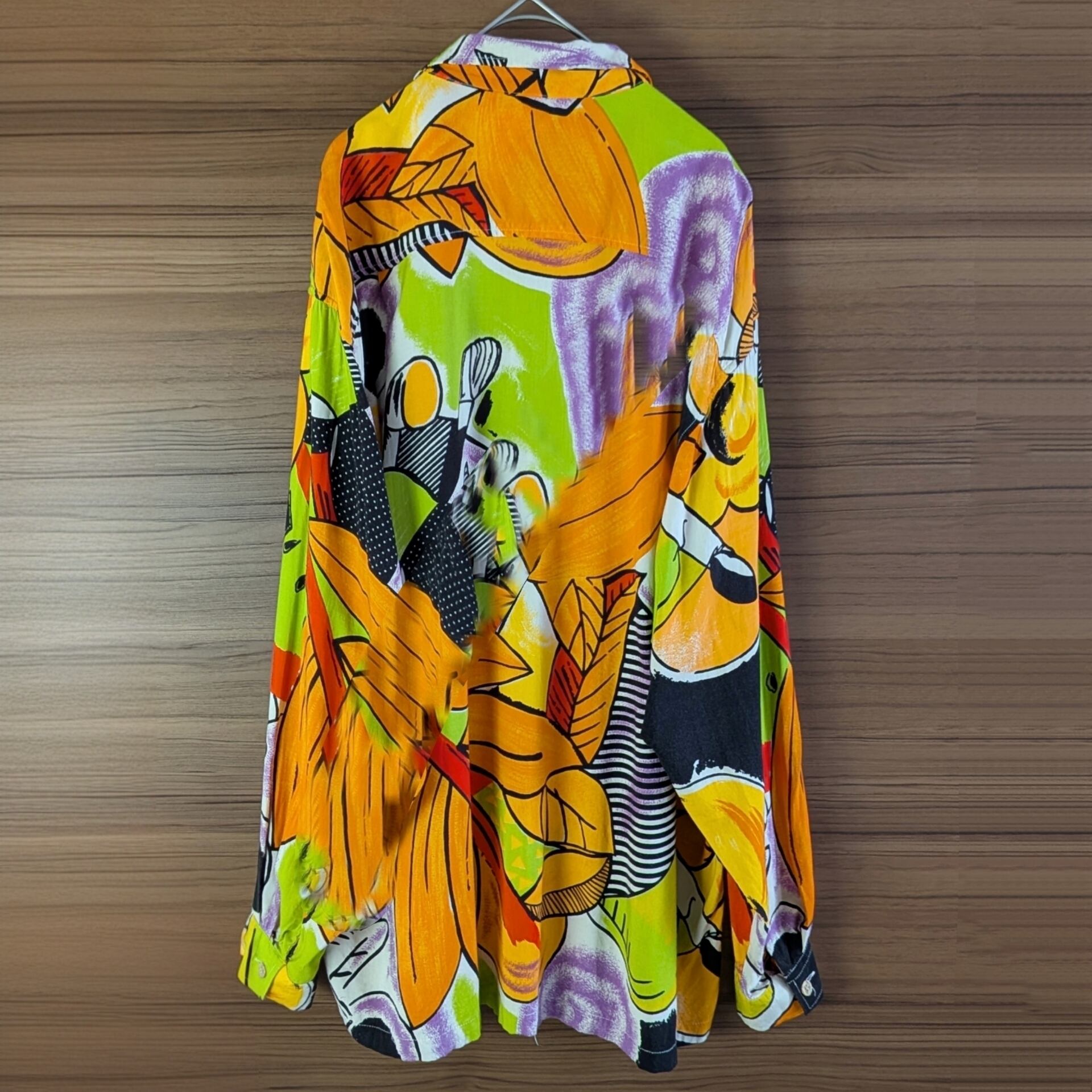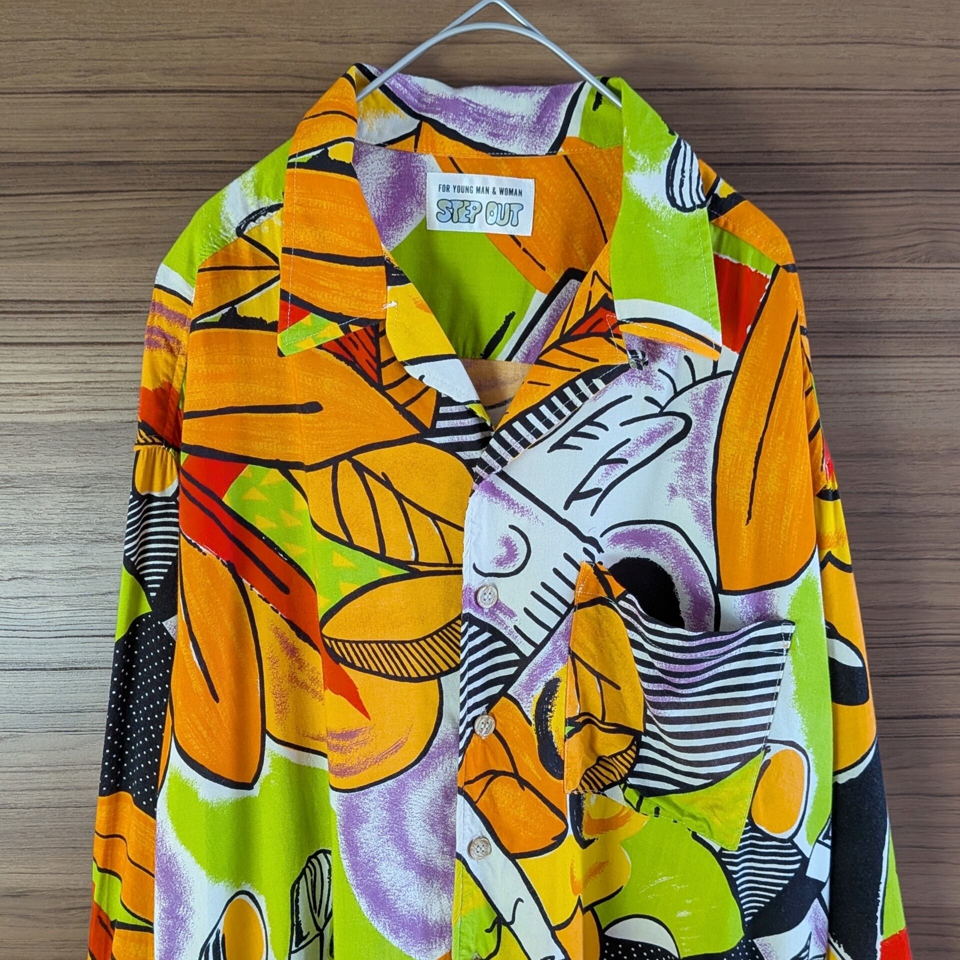 【一歩踏み出す、鮮烈な抽象。】STEP OUT 総柄レーヨンシャツ / 90s アーバン・ビビッド 古着