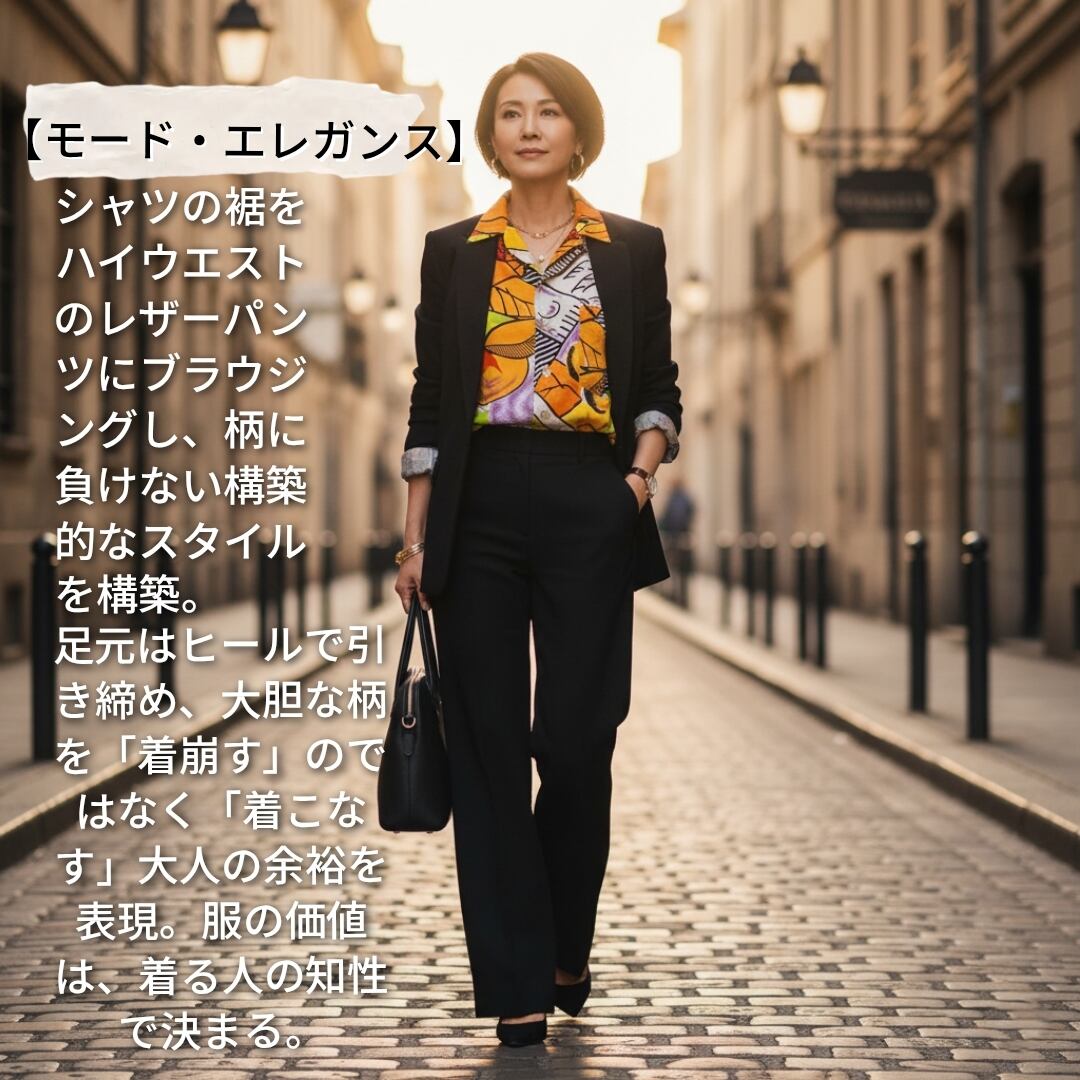 レトロ&モードには、黒のスラックスやレザーアイテムと合わせれば、柄の持つレトロなエッセンスがモードな雰囲気へと昇華します。