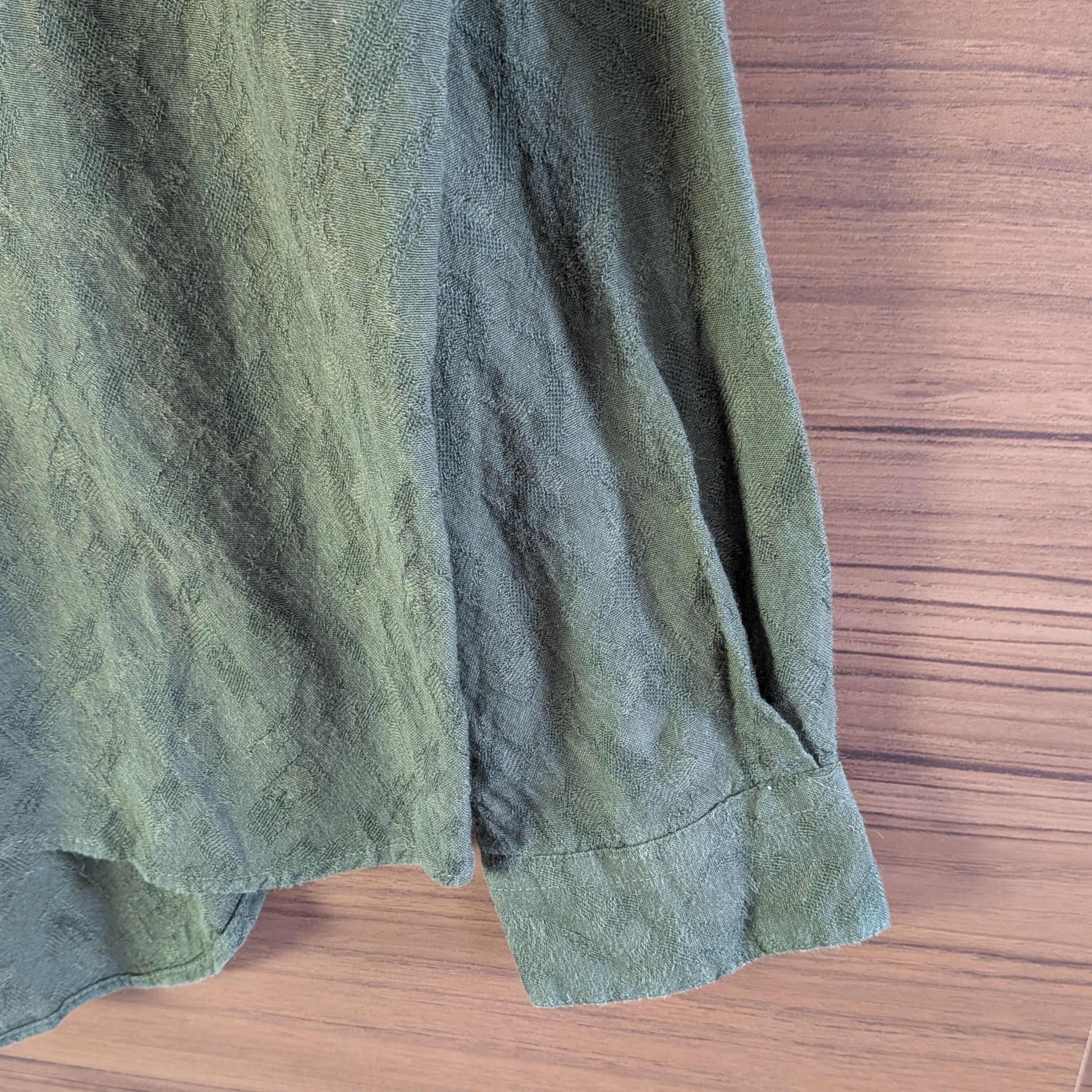 麻のシャリ感、綿の素朴さ、そしてレーヨンの優雅な落ち感。それらが織りなす独特の表情を持つこのシャツは、単なる古着を超えた、深い知性と洗練を湛えています。
